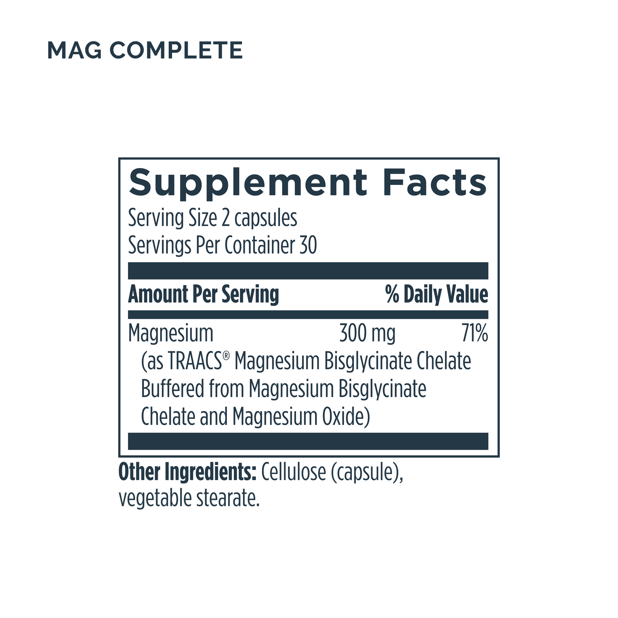 Mag Complete is a chelated form of magnesium bonded to the amino acid glycine. This formulation is absorbed more quickly, better retained by the body, and eliminates the loose stools or upset stomach that may occur with non-chelated forms of magnesium. Magnesium is the second most abundant mineral inside cells, where it is crucial for energy production, bone and muscle health, physical strength and mobility, neurological health, and metabolism. Mag Complete is ideal for anyone wanting to reap the health benefits of magnesium where they are needed most, including those with compromised digestion.